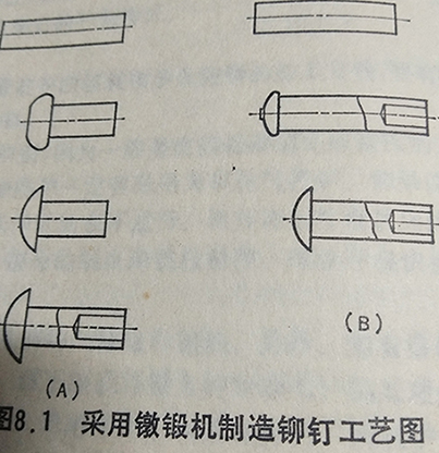第一種方法是采用實(shí)心鉚釘成型同樣的鐓鍛機(jī)加工成實(shí)心體的鉚釘,然后在桿端用專用的鉆床二次加工圓柱孔